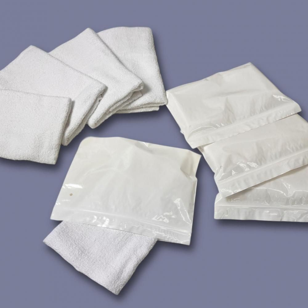 宿泊施設や温浴施設など様々なところで、提供されるベーシックな白のプレーンタオルのジッパーバッグ袋入りサービスタオルです。
